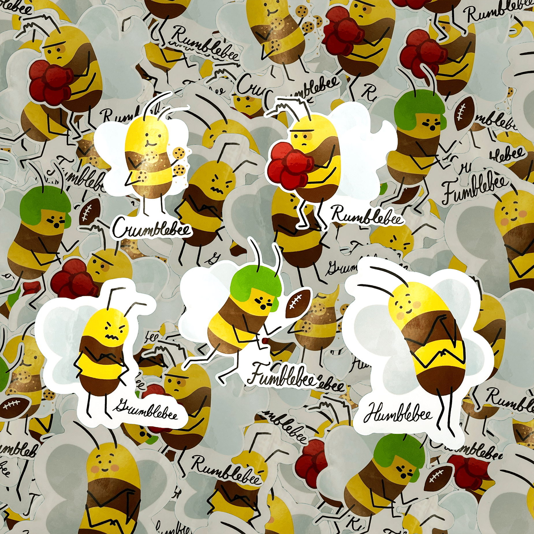 Little pollinator buddies. Glossy laminated polypropylene die-cut stickers. Water- and scratch-resistant. Various sizes, all roughly 2"x3."